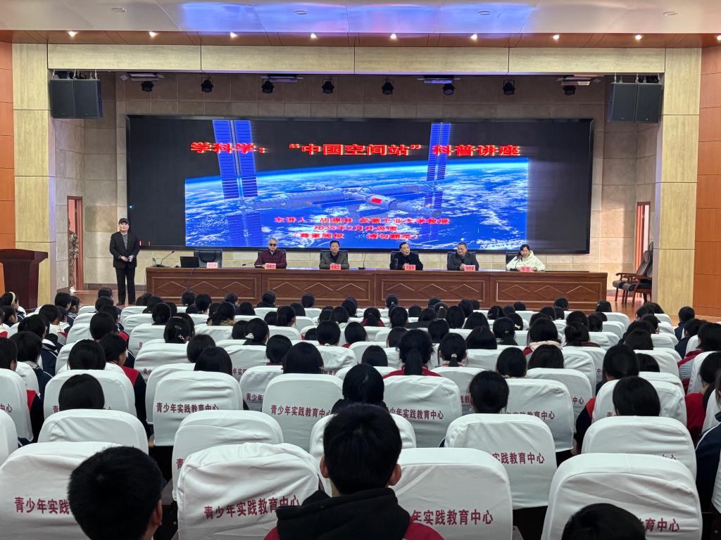 2月26日上午,由市关工委、市教育局主办,市青少年实践教育中心承办的宣讲活动在市青少年实践教育中心举行。我校关工委副主任、市关工委科技教育报告团团长胡源申教授应邀为正在参加八年级综合实践活动的同学们作了题为《中国空间站》的科普讲座。